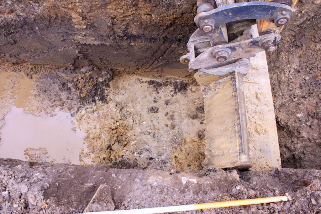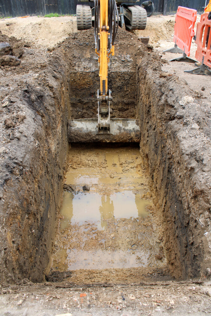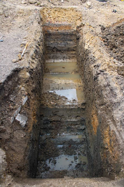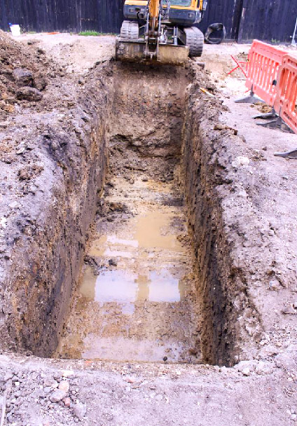 The assessment results led to a site investigation and two evaluation trenches were opened within the footprint of the extension and excavated to depths of 1.7m and 2.85m where disturbed buried soils were found overlying the natural gravelly geology.