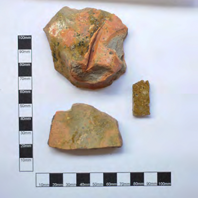 Evidence of late medieval deposits were encountered in areas of deeper excavation. These produced sherds of medieval glazed pottery, rooftile fragments and CBM, all of which can be dated to the 14th or 15th centuries, with both the pottery and CBM originating in either Herefordshire or from the Malvern Chase industries. The ceramic assemblage included three sherds of pottery with patchy external green glaze which included part of a jug and rod handle with central groove and a single sherd with a clear speckled glaze.