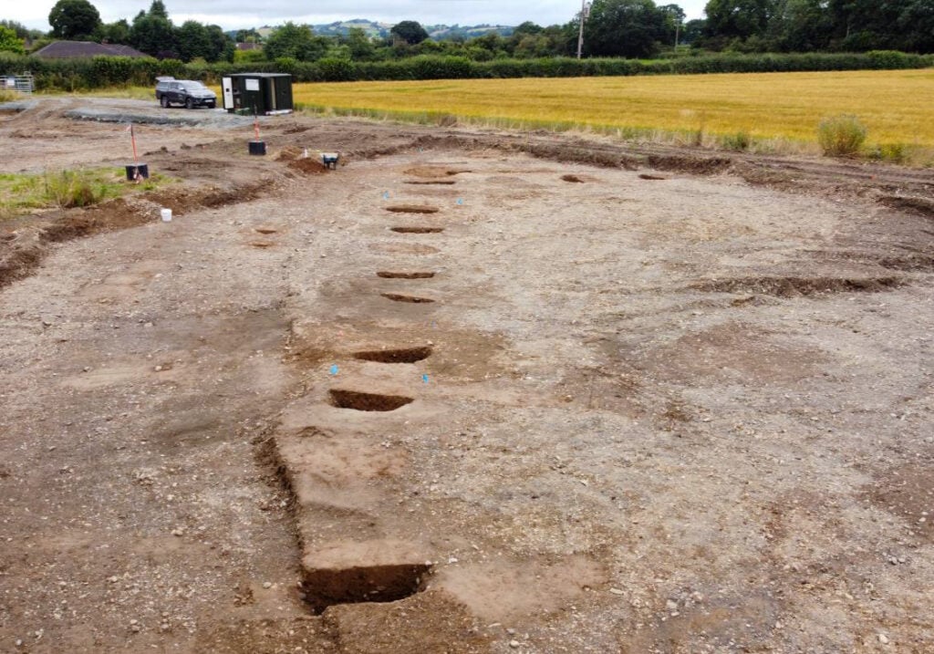 Long buried under rolling farmland to the north of Welshpool, where the village of Llanymynech sits astride the Welsh border, two mysterious pit alignments visible only as  dotted lines of cropmarks on aerial photographs could be seen running for some distance across fields bordering the canal.