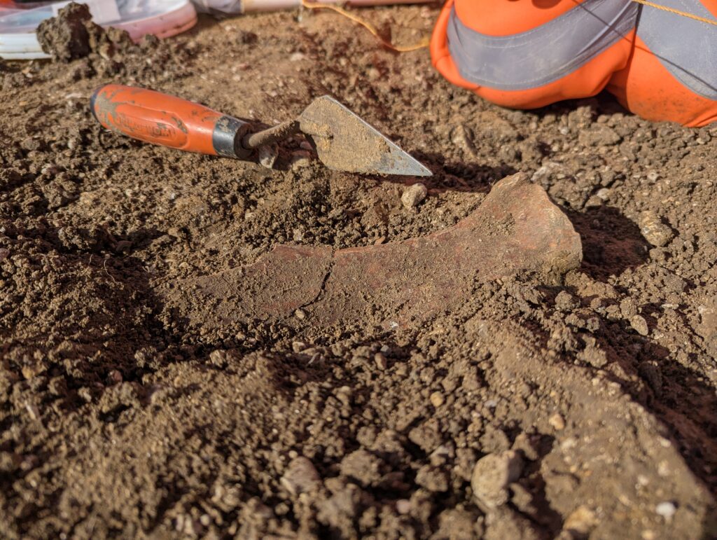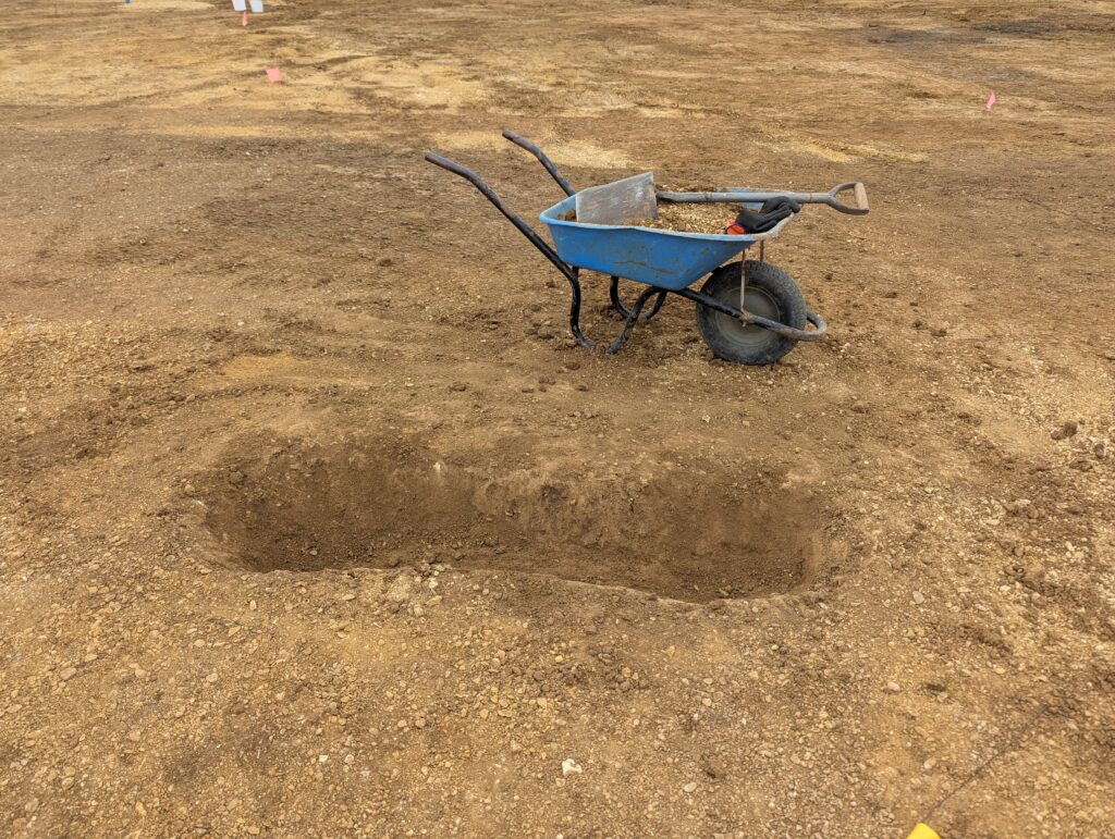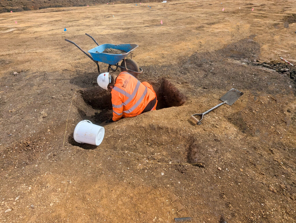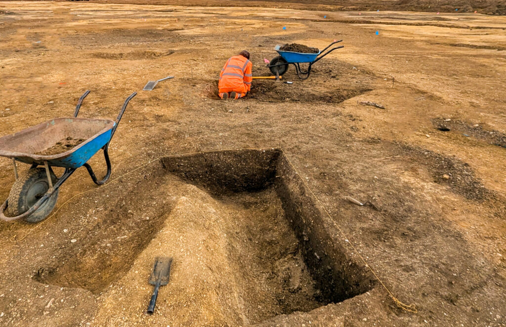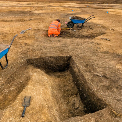Strip Map and Record/ Sample involves archaeologically controlled machine excavation down to the first significant archaeological horizon, which is then recorded prior to detailed investigation of a specified sample of features such as ditches, pits or structures. Features such as burials will generally be fully excavated. It is worth noting that an archaeological horizon is defined as the depth at which demonstrable evidence of prior human activity has been discerned.